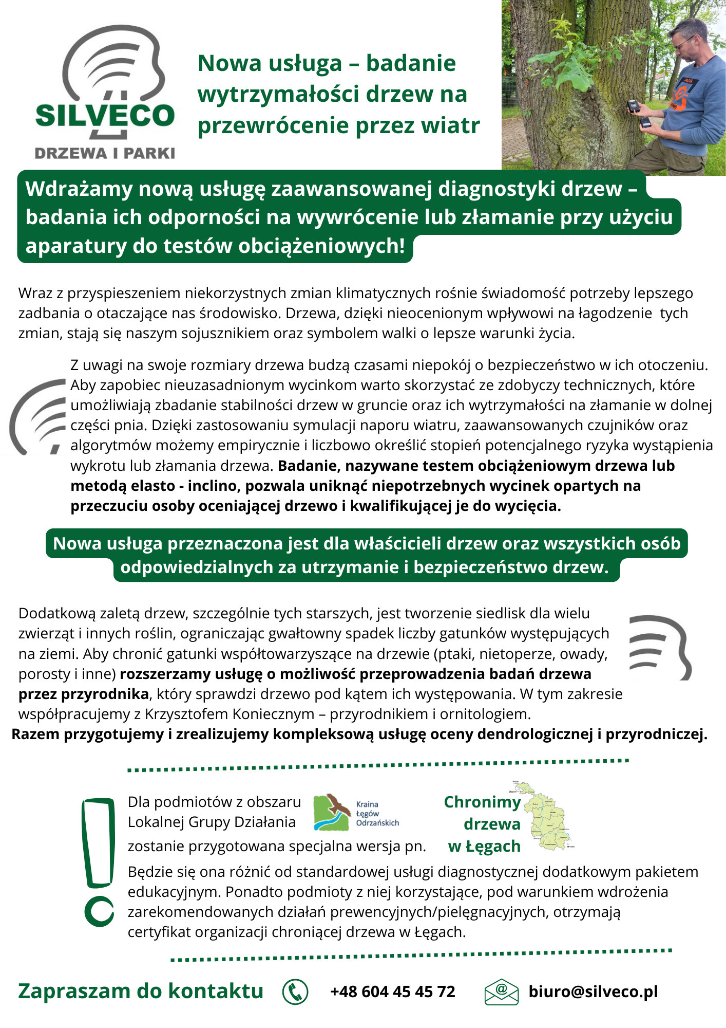 UWAGA: dla podmiotów z obszaru Lokalnej Grupy Działania Kraina Łęgów Odrzańskich zostanie przygotowana specjalna wersja pn. „Chronimy drzewa w Łęgach”. Będzie się ona różnić od standardowej usługi diagnostycznej dodatkowym pakietem edukacyjnym. Ponadto podmioty z niej korzystające, pod warunkiem wdrożenia zarekomendowanych działań prewencyjnych/pielęgnacyjnych, otrzymają certyfikat organizacji chroniącej drzewa w Łęgach.